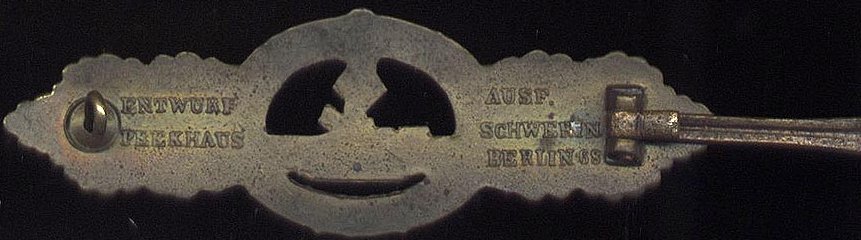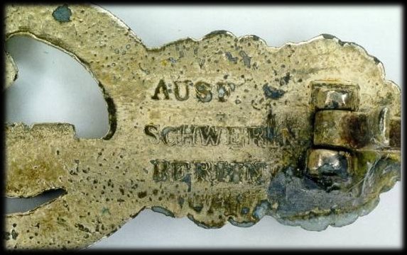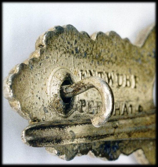 Both classes of the badge were manufactured in zinc, then bronzed or silvered. The main manufacturer was Schwerin of Berlin which name was impressed on the reverse. It seems that Rudolf Karneht and Friedrich Linden also manufactured this badge but no examples are known by the author. The colour varied according to the quality and the age. Schwerin manufactured two types of badges, one of which has a semi-hollow wreath back side. The hook is rounded and catch and pin are hollow.
