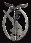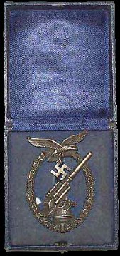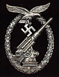 The badge consists of an 8.8cm anti aircraft gun, surrounded by an oak leaves crown , surmounted by a soldered or riveted Luftwaffe eagle. On the reverse there is a thin needle round pin. In most cases, a rounded cut out portion can be observed under the gun barrel.