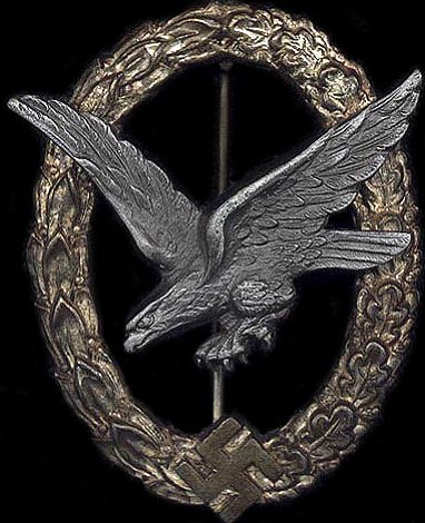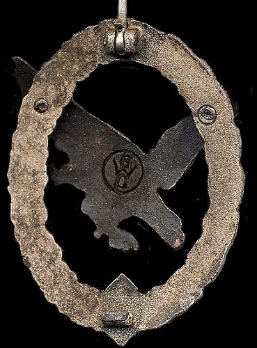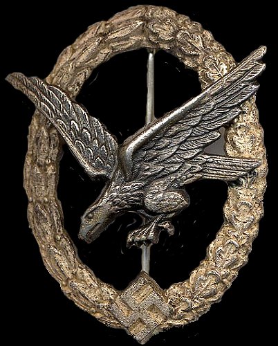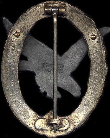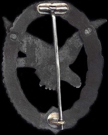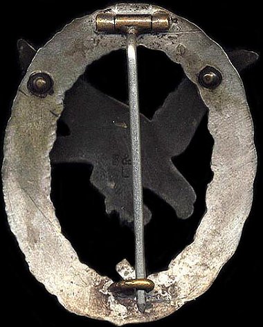 Quality examples were initially made in Tombak, but most examples found will be constructed of zinc or kreigsmetal. The silver plated wreath is in the shape of an oval, with a slightly convex design. On the front of the badge, the wreath is covered half with oak leaves and the other half in laurel leaves. In the center of the wreath at the bottom is a swastika. Mounted in the center of the wreath is an eagle in flight, diving to the left. Most badges were produced with the eagle in the same metal as the wreath. While seldom encountered, some versions may have been constructed with an aluminum eagle on a zinc wreath. The eagle is darkened, finished in alt-silver, deep blued, or anodized black. The highlights of the wreath and the swastika are polished. Some examples exhibit a cut-out upper arm of the swastika.