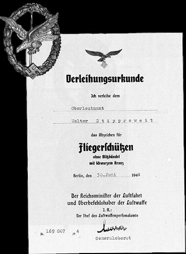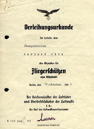 Each recipient of the Air Gunner’s and Flight Engineer’s Badge had an entry made in his Soldbuch. An additional Award Document was presented at a later date.