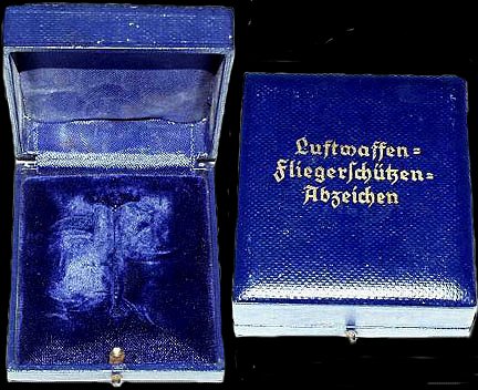 The Air Gunner’s and Flight Engineer’s Badge was awarded in a dark blue case. The interior had a blue satin upper lid lining, and blue flocking in the lower base. The two halves were hinged in the rear and secured by a spring tension pin/ catch device. Across the exterior lid was embossed Luftwaffen= Fliegerschutzen= Abzeichen, or Bordmechanikerabz, in silver lettering. The badge was to be worn on the recipient’s left side, on or near the pocket, and below the Iron Cross 1st Class.