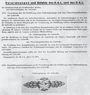 On the 3rd of November, 1944, Herman Göring created new decorations for the men of the Luftwaffe, one of which was the Luftwaffe Close Combat Clasp, with the order translated below,