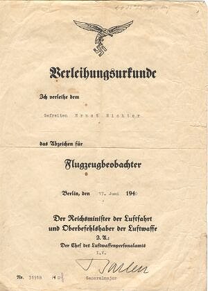 Certificate #31918 awarded to Gefreiten Ernst Richter in June 1940. He is recorded as winning the German Cross in Gold in January 1945 whilst a Leutnant in a Stuka squadron.