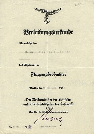Certificate #62048 awarded to Flieger Herbert Fuchs in November 1940.  Fuchs was an Observer in Lehrgeschwader 1 and was awarded the Honour Goblet in September 1943.