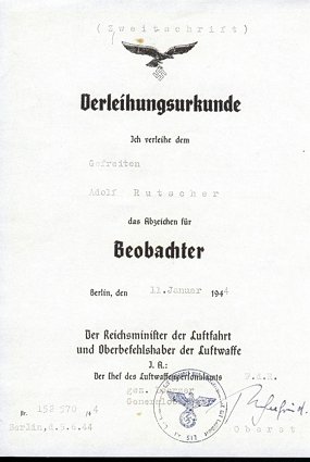 A second issue ("Zweitschrift") document - the original certificate #152 570 was awarded to Gefreiten Adolf Rutscher in January 1944.  This reissue occurred in May 1944.
