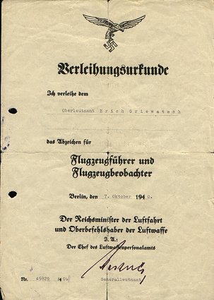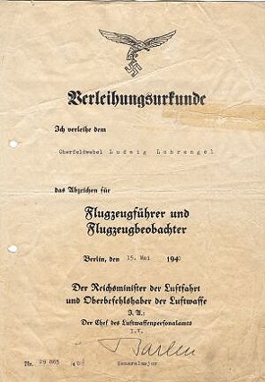 Certificate #29865 awarded to Oberfeldwebel Ludwig Lohrengel in May 1940. This document bears the signature of section chief Generalmajor Karl Barlen who signed on behalf of the Chief of the Luftwaffe Personnel Office ("i.V." is "in Vertetung" = in deputation/signed for). Generalmajor Karl Barlen (1890-1956) became a General der