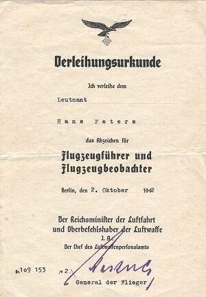 Certificate #109153 awarded to Leutnant Hans Peters in October 1942. Peters went on to win the Honour Goblet (October 1942) and the German Cross in Gold (January 1945). This document also bears the facsimile signature of General der Flieger Gustav Kastner-Kirdorf. Size: A5
