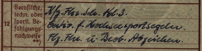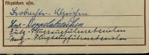 A Luftwaffe Wehrpass entry which records the award of the "Doppelabziechen". The recipient, Oberleutnant Günter Bach, a German Cross in Gold and Honour Goblet winner, also received the Bulgarian and Hungarian Pilot's Badges. |