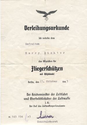 Certificate #143194 awarded to Gefreiten Harry Richter in October 1943.  The designation "mit Blitzbündel" denotes the Radio Operator award.