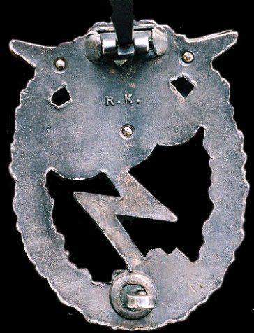 The Ground Assault Badge consists of a Luftwaffe eagle flying above a storm cloud, which generates a lightening bolt that strikes rough ground. In most cases, the Luftwaffe eagle is a separate, stamped nickel piece and is riveted on top of an eagles’ outline on the badge. This can either be done by three domed rivets, two domed rivets, or one flush rivet. On some late war badges, the eagle is cast as an integral part of the badge itself, with no need for a separate piece. The eagles' wings protrude outside the wreath of oak leaves that surrounds it. These badges were produced with both silver and darkened wreaths