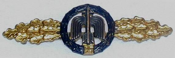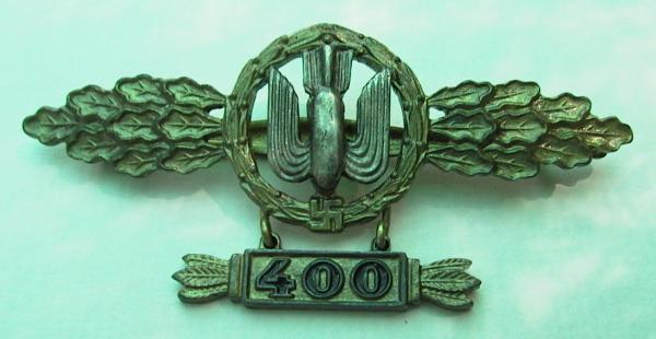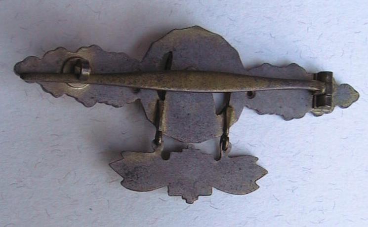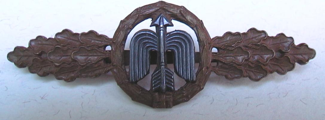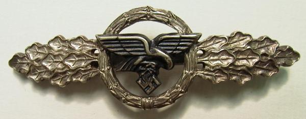 Commonly referred to by collectors as Flight Bars, Operational Flying Clasps or Squadron Clasps, these badges consist of a central device encircled by a wreath of laurel leaves set between two 'wings' of oak leaves.   In most designs, the ubiquitous swastika is set at the base of the wreath.  Clasps measure around 7.5cm x 2.5cm (3" x 1").  The central device distinguishes between the types of flight undertaken.  The color of the clasp, with the exception of the center which is usually blackened, identifies the number of flights achieved.  Thus, the BRONZE clasp was awarded for 20 flights SILVER clasp was awarded for 60 flights GOLD clasp was awarded for 100 flights.