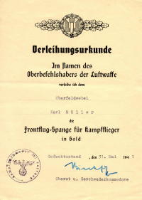 The above document for the Gold award of the Bomber Clasp was awarded to pilot Oberfeldwebel Karl Muller who won the Knight's Cross in October 1942 as a member of KG2.