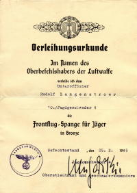 A document accompanied the award of a clasp.  Here is the document for the Bronze Fighter Clasp awarded to Unteroffizier Rudolf Langenstroer, a pilot who flew with JG4. Note the attractive illustration of the clasp at the top.  This is the usual DINA5 (15 x 21cm) sized document.