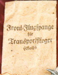 Here the central device of the Luftwaffe eagle flying to the right denotes the award for Transport and Glider Squadron aircrew.  Note that in this design the swastika is carried by the eagle, unlike all other clasps where it features at the base of the laurel wreath.