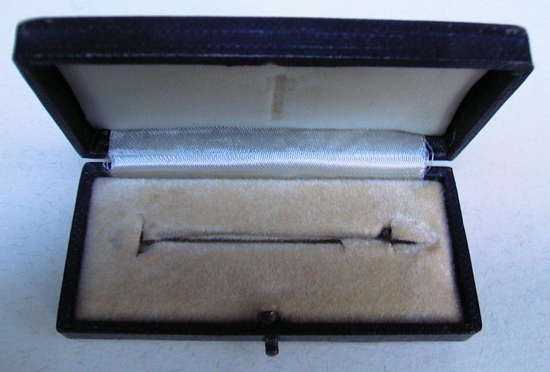 Clasps were presented in a small, dark blue, rectangular case with the designation of the award imprinted on the lid in gold.  These cases measure around 9 x 4 x 1.5cm.  Note the materials commonly used to line the case: white silk for the lid and cream colored flocking to form the base.  Late in the war, clasps were shipped in simple paper envelopes, similar to other awards of the period.