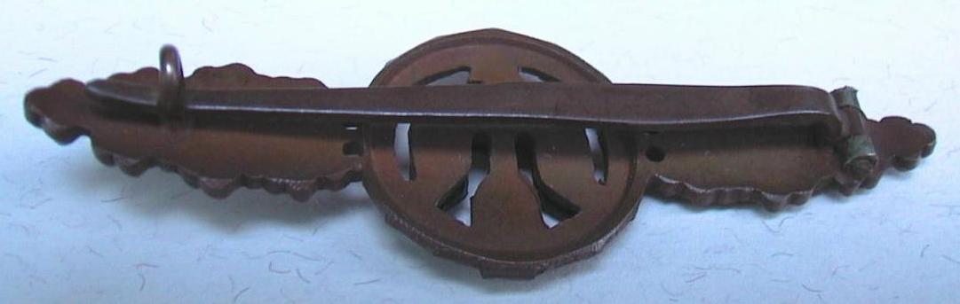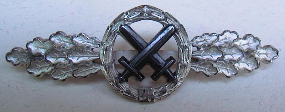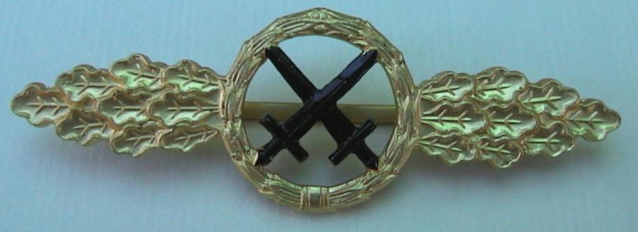Created in April, 1944, the central device of the crossed swords denotes the award to Air to Ground Support Squadron flyers .... the "Schlachtflieger". Formerly, these personnel were awarded the clasp with the inverted winged arrow (see above). This Osang produced zinc clasp is rather special - it has most of the original finish intact!