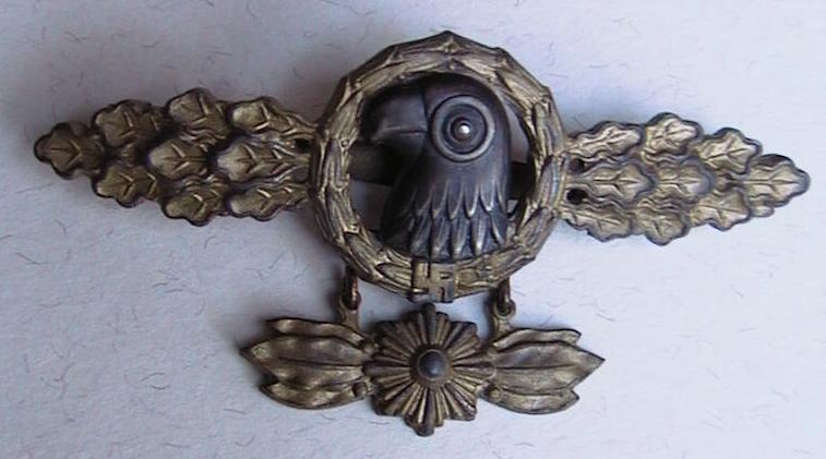 The central device of the eagle's head facing to the right denotes the award to Reconnaissance, Air-Sea Rescue and Meteorological flyers.  In this unmarked example note the "star pendant" attached to the basic bar ... as operational flights quickly began to exceed the 110 represented by a Gold award, it became necessary to recognize these achievements by enhancing the badge.  Introduced in June 1942, the pendant represents the completion of the following numbers of operational flights:
