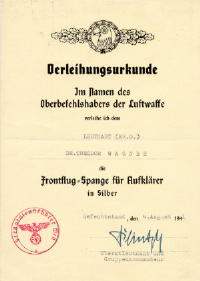 The document of the Reconnaissance award in Silver to Leutnant Theodore Wagner, an Observer in an Air-Sea Rescue squadron. Leutnant Wagner won the German Cross in Gold and Goblet of Honor.