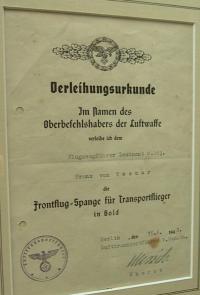 The document awarded to Leutnant Franz von Tesmar, a pilot (and adjutant) in a Transport squadron, winner of the German Cross in Gold and the Goblet of Honor.