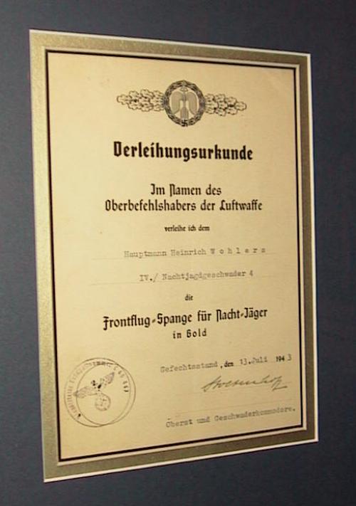 This is the rare document for the Night-Fighter Clasp with the usual illustration appearing at the top.  The device of the winged arrow is that of the Day Fighter clasp .... but note the blackened wreath, denoting the Nachtjager. Arrow up ... Short Range Night Fighter Squadrons. Arrow down ... Long Range Night Fighter Squadrons.  The recipient was Hauptmann Heinrich Wohlers who won the Knight's Cross in December 1943. He scored 29 night victories before his death in March 1944. At the time of the award he was the Gruppenkommandeur of IV./NJG4. He later became Geschwaderkommodore of NJG6.