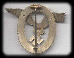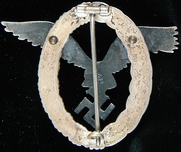 As with most Third Reich items, the pilot badge can be found in materials of different quality. Aluminum, nickel-silver, plated tombak, plated alloy and lacquered zinc were all used. Pre and early war versions tend to be executed in high quality nickel and tombak, while the mid to late war pieces tend to be of the alloy and zinc variety. Aluminum was used in the late 1930’s, but was rather quickly deemed unsuitable. Original aluminum badges are prized for their rarity and pristine finish. Pin assemblies are normally nickel or nickel plated tombak on earlier badges. Later types often have pins and hinges made of steel or alloy.