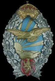 Bulgarian pilot badge: The pilot badges issued by the Kingdom of Bulgaria are, in the author’s opinion, among the most attractive aircrew insignia ever made. Of a multi-piece construction, the Bulgarian pilot badge consists of an oval, stamped, silvered front plate with a separately applied gilt eagle. The edges of the oval have a wreath pattern with an Imperial crown (also gilt) at the top and a bow at the bottom surmounted by a shield with a rampant lion motif in the center.The obverse of the badge has exceptionally fine enamel work in the form of sky blue “rays” and a red background to the crown and shield. The reverse has a very shiny, rounded silver backing plate and a screw back attachment. The example in my collection, and the other originals I have seen, have cyrillic markings in a circle on the shiny backing plate and on the brass nut for the screwback.. The Bulgarian pilot badge was typically worn on the lower left tunic pocket.