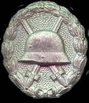 The history of the German wound badge dates back to World War I.  Kaiser Wilhelm II established the first German Military Wound badge (Verwundetenzbzeichen) on March 3rd, 1918, with a the declaration stating that it would be presented in 3 grades. It was to awarded in black for one to two wounds, in silver for three to four wounds, and in gold for five wounds or more.  In cases of severe wounds the higher class was presented.  The Imperial Wound badge was to provide the basis for ones issued during World War II.  It was an oval badge with laurels surrounding the edges and a ribbon at the base.  In the center of the badge is an Imperial helmet, with a pair of swords behind it. The background of the center is pebbled, though in one variation the background of the badge is hollowed. The silver grade of the Imperial Wound badge is pictured to the right.