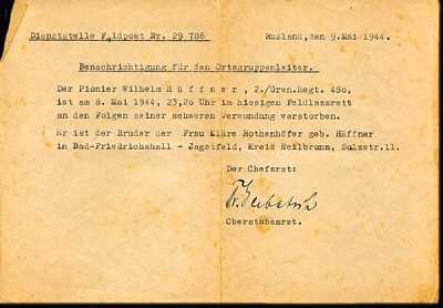 Notification to the Local Branch Chief The Pioneer Wilhelm Haeffner, 2. Infantry Regiment 480, succumbed on May 8, 1944, 11:20 p.m. in the local field hospital due to serious injuries. He is the brother of Mrs. Klaere Rothenhoefer, nee Haeffner, at (ADDRESS) The Office of the Chief Doctor |