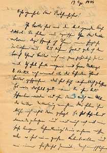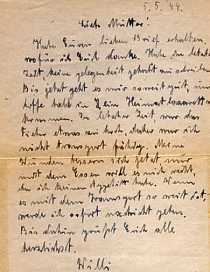 Dear Mother! Received your sweet letter. I thank you. Lately I had no opportunity to write. I am doing fine and I hope to be soon transferred to a hospital in the home land. Until now my fever was too high to allow a transfer. My wounds are healing. But my appetite is missing and I eat very little. I will let you know as soon as I can about my transfer. Until then greetings to all of you, Willi. |