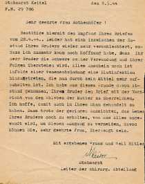 Staff Doctor Keitel, Field Post Office Number 29786, May 8. 44 My dear Mrs. Rothenhoefer! I acknowledge herewith the receipt of your letter dated Apr 28, 44. Unfortunately, your brother's condition has become so bad that little hope exists that he will recover from his serious wounds. It seems that blood poisoning has occurred which can not be stopped. For this reason I did not give him your letter which contained word about the death of your (HIS) Mother. I hope to have acted according to your wishes. You can be sure that in spite of the hopelessness, we are doing our very best to keep your brother alive. With devoted greetings and Heil Hitler, (SIGNATURE) Staff Doctor and Chief of the Surgery Department |