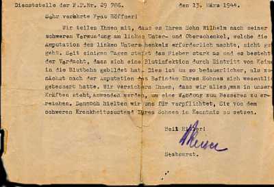Mrs. Klaere Rothenhoefer, nee Haeffner I am fulfilling my sad duty to inform you that your brother, the Pioneer Wilhem Haeffner, 2. Company, Infantry Regiment 480,died on May 8, 1944, 11:20 p.m. in the local field hospital. Your brother was seriously wounded on February 2 in front line action south of Mogilev, middle section, by shell fragments. The shell fragments entered and lodged in his left shoulder, left upper arm, left elbow, and left knee. After initial first aid in the field, your brother was brought the same day to the local field hospital where he was treated with the best help available. But all medical skill and several operations were insufficient. He recuperated somewhat in March to the point that we had hope to keep him alive. But since then his condition worsened and ended with his death in spite of all medical help available As most serious injured do, your brother talked little and slept most of the time. We fulfilled all his wishes. Our staff did all they could to make his life as bearable as possible. Eventually, your brother fell into a coma as a result of blood poisoning, he was not aware that his end was near. Unfortunately, neither did he leave any parting words for his kin. I want to express my deepest sympathy to the loss of your brother. May the knowledge that your brother gave his life for the Greater Germany and its future be soothing for your heartaches. He was interred with military honors in the veterans cemetery here in Mogilev, Pilgrim Street. (EAST OF MINSK, IN TODAY'S BELORUSSIA) The details about his burial plot and maintenance thereof will be made available to you at a later time through the appropriate military department. Please acknowledge the receipt of this letter by returning the enclosed post card so that we can send you his personal belongings. I am expressing my sympathy and remain with a Heil Hitler (SIGNATURE) Senior Staff Doctor and Chief Doctor. |
